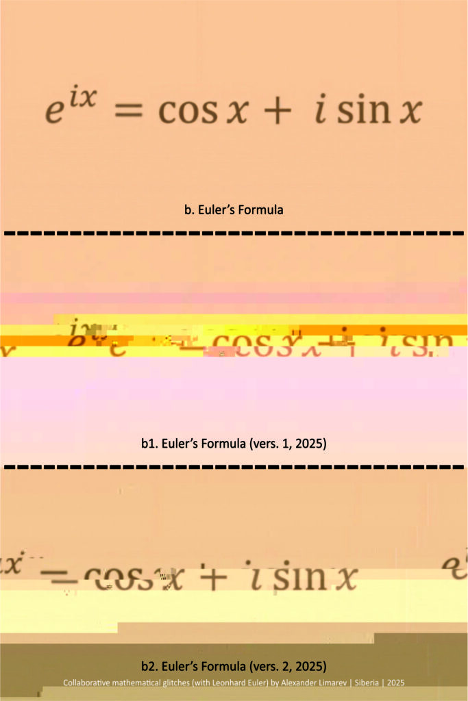 2.  b. Euler’s Formula; b1. Euler’s Formula (vers.1, 2025); b2. Euler’s Formula (vers.2, 2025) by Alexander Limarev | visual poetry, glitch art | 2025
