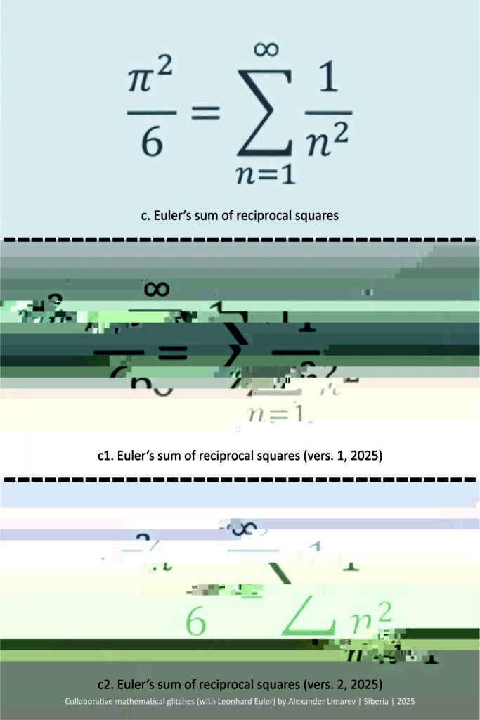 3.  c. Euler’s sum of reciprocal squares; c1. Euler’s sum of reciprocal squares (vers.1, 2025); c2. Euler’s sum of reciprocal squares (vers.2, 2025) by Alexander Limarev | visual poetry, glitch art | 2025